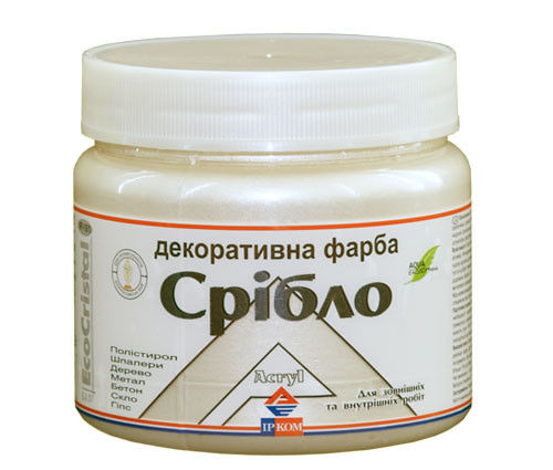 Универсальная акриловая водорастворимая декоративная краска имитирует цвет серебра. Краска используется, как и для внутренних, так и наружных работ. Подходит для многих видов поверхностей: гипса, кирпича, дерева,стекла, цемента, металла, а так же для обоев и штукатурки.