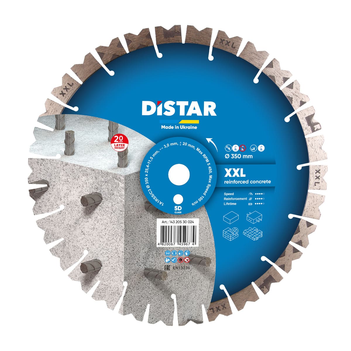 XXL. Диск на виріст. Це диск із найвищим алмазоносним сегментом на ринку - 20 мм. Він призначений для роботи по армованому бетону. Диск відмінно справляється з цим важкооброблюваним будівельним матеріалом, оскільки має низку унікальних властивостей. Корпус диска виготовлений з високоміцної сталі, що дає йому змогу витримувати високі навантаження під час різання. Кілька рядів отворів у корпусі сприяють його ефективному охолодженню. Диск має зовнішній діаметр 350 мм, посадковий отвір 25,4 мм. Диск використовують на бензорізах і швонарізувачах із застосуванням охолодження.