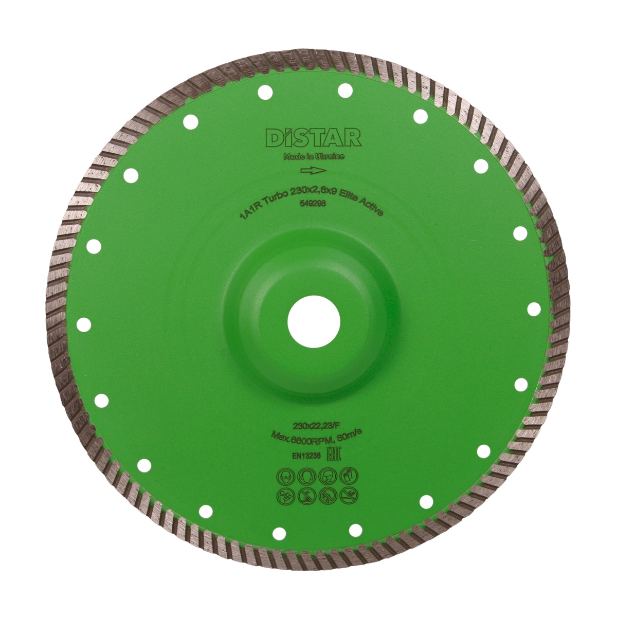 Диск алмазний Distar Turbo Elite Active має гнутий фланець, що відмінно підходить для роботи з гранітом, завдяки міцному корпусу, представляється можливим різати будь-які види граніту. Включаючи в цей список і габро, варто відзначити, що його зручно застосовувати для підрізки натурального каменю. За рахунок того, що безпосередньо вал ховається (з цієї причини виконаний гнутий фланець) стає можливим підрізання матеріалу на велику глибину. Диск алмазний Turbo Elite Active працює зі швидкістю різу в 1 м/хв, при своєму ресурсі роботи в 100 погонних метрів. Має відмінну швидкість обертання, через що заслужено отримав 4 зірки. При цьому має помірний ресурс роботи, та впорається з більшістю природних матеріалів.